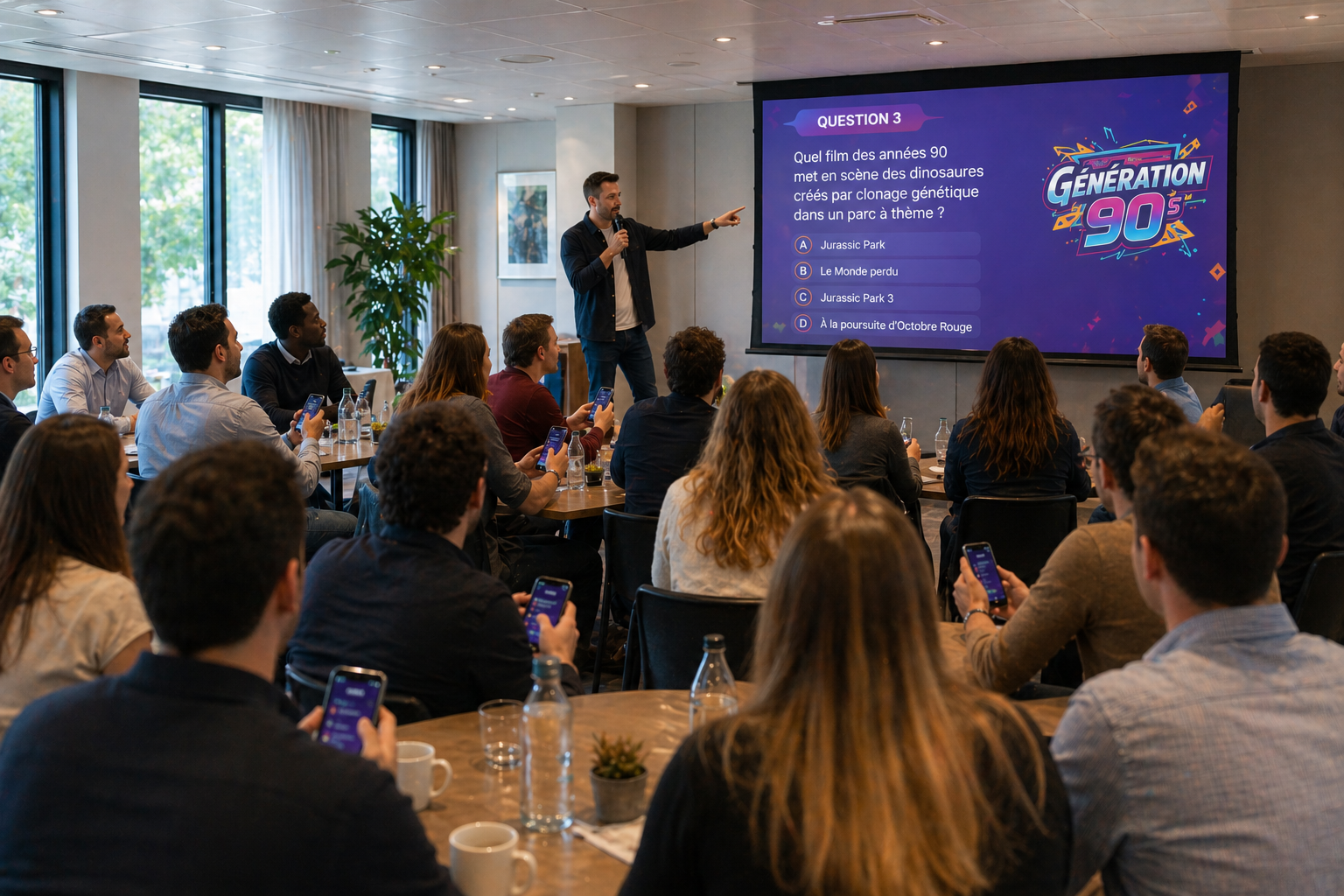 Génération 90 est un team building quiz immersif qui replonge vos équipes dans la décennie culte. Les questions s’enchaînent sur la musique, le ciné, les pubs, les jeux vidéo, les objets cultes — et au fil du jeu, les souvenirs reviennent en cascade.