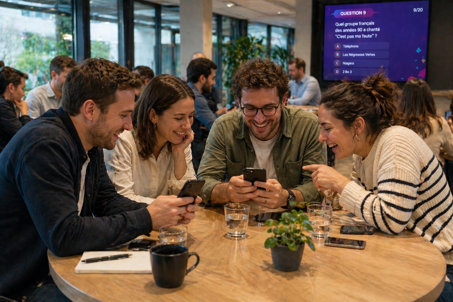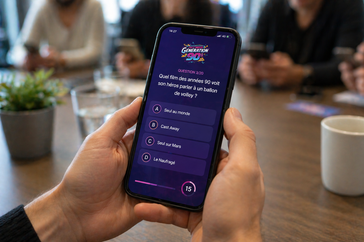 Non, Génération 90 est conçu exclusivement pour le présentiel. L’ambiance immersive, les jingles à plein volume, les fous-rires partagés et les discussions qui rebondissent autour des souvenirs reposent sur l’interaction physique entre les équipes — c’est ce qui fait la magie du format.